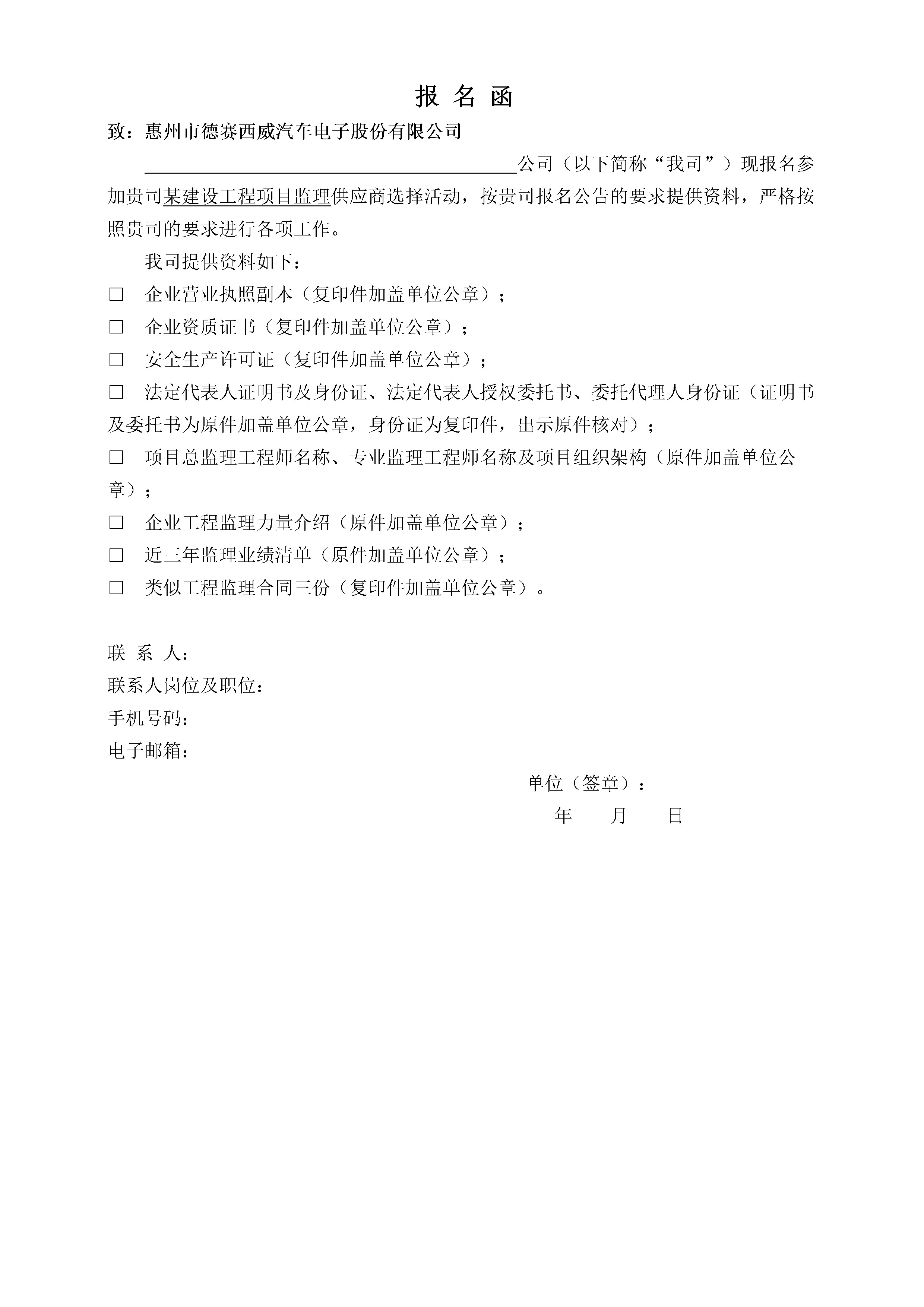 需提供的资料包括:①三证合一的企业营业执照副本;②企业资质证书;(注:①~②项应为复印件加盖单位公章)③法定代表人证实书及身份证、法定代表人授权委托书、被委托人身份证;④本工程拟接纳项目总监理工程师名称、专业监理工程师名称及项目组织架构;⑤企业工程监理力量先容;⑥工程监理业绩(要求提供近三年业绩清单原件,3份以上能反应公司实力的类似监理条约复印件加盖单位公章);⑦报名函(见附件)。